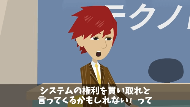 今回は『社長「息子にパワハラしたのでクビで(笑)」俺「いいのね?」後日⇒社長が青ざめたワケ』を紹介します。 主人公がシステムの権利の買い取りを拒否すると、部下は「それじゃあ、あんたの会社だって困るだろうが!?」と言いました。 すると大手企業の社長が、すでにそのことについては主人公と話をしたと言い…。