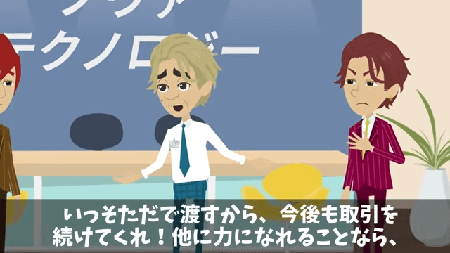 今回は『社長「息子にパワハラしたのでクビで(笑)」俺「いいのね?」後日⇒社長が青ざめたワケ』を紹介します。 主人公の話を聞いて焦った社長は、システムの権利を1万円で譲るから今後も仕事を任せてほしいと言い出しました。 それを聞いた部下は「お、おい、親父!下手に出るなって、何度言ったら…」と怒って…。