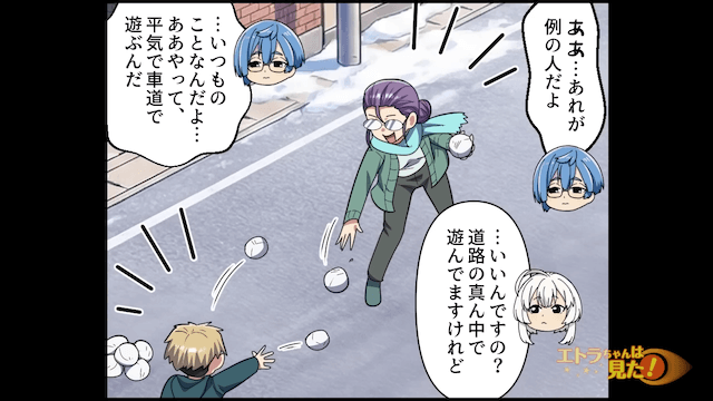 友人に悩みを打ち明けた後、外で隣人とその息子が雪合戦をしていることに気づいた主人公。 隣人が投げた雪玉は主人公の車に直撃し、それを見た主人公は愕然としてしまいます。