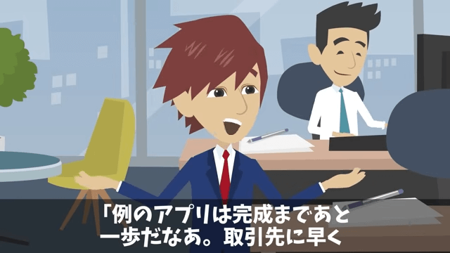 アプリ開発メーカーで働く主人公は、プロジェクト成功のために同僚たちと働いています。 あと一歩でアプリが完成するため、主人公は「取引先に報告できるのが楽しみだ」と言い…。