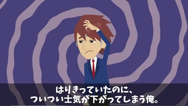 会議室に入った途端、足が止まりそうになる主人公。 中央に座っている部長たちが会議室の空気を支配しているような雰囲気で、主人公の士気は下がってしまい…。