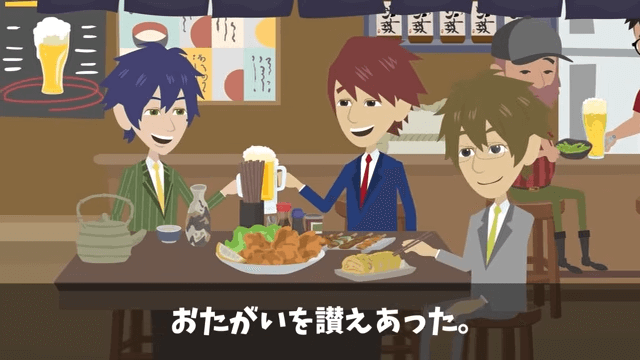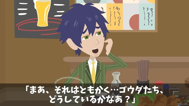 休日、主人公たちは居酒屋でお互いを讃え合っていました。 そんな中、同僚が「部長たち、どうしているかなぁ?」と言い始めて…。