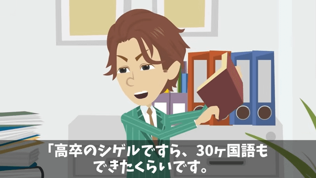 部長たちは異国の地における言語の壁に頭を抱えていました。 すると部長の部下は、主人公でも30ヶ国語をマスターできたのだから自分たちもなんとかなるはずだと言い…。