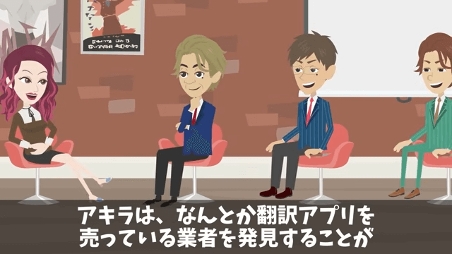 部長たちは仕方なく主人公の翻訳アプリに頼ることにしました。 そして国内を探し回り、ようやく翻訳アプリを売っている業者を発見したのです。