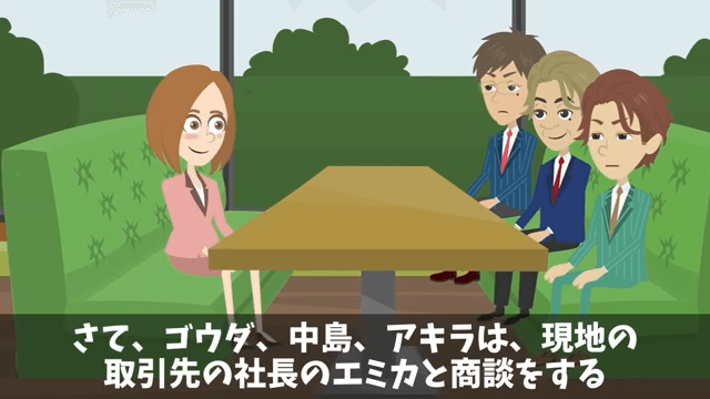 翻訳アプリを入手できた部長たちは満面の笑みを浮かべます。 そして現地の取引先の社長と商談をすることになったのですが…。