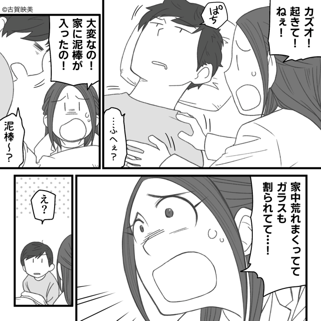 帰宅すると家の中は荒れていて、空き巣の仕業だと考えた主人公。 呑気に寝ている夫を慌てて起こし、状況を伝えました。