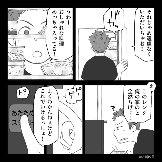 今回は『出張帰り、新居が荒らされていた衝撃の理由』を紹介します。 夫は自分の友人たちを家に招き、お酒を飲み始めます。 友人に「なんかつまみねぇの?」と聞かれ、夫は「作り置きがある!」と答え…。