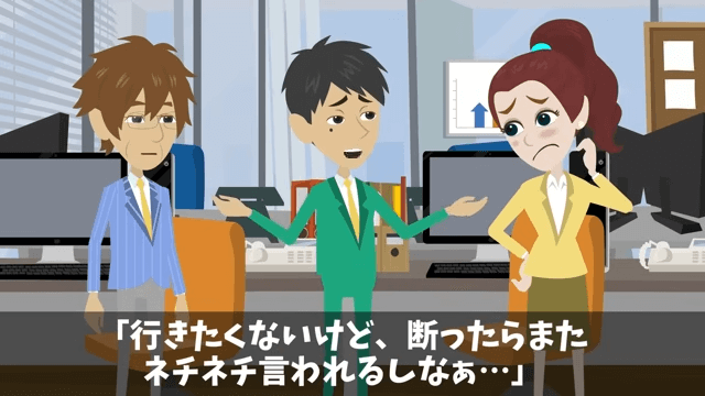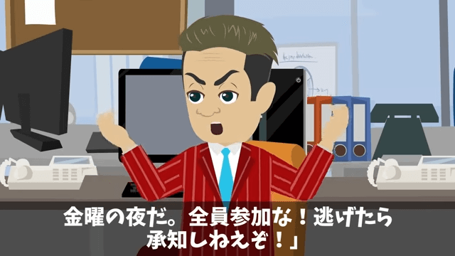 課長は「金曜の夜だ。全員参加な!逃げたら承知しねえぞ!」と言いました。 それに対し男性の部下は「行きたくないけど、断ったらまたネチネチ言われるしなぁ…」と言い…。