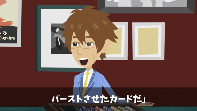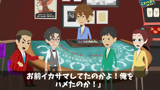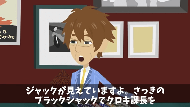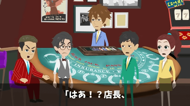 主人公は店長が右袖の中にカードを仕込んでいることを指摘しました。 すると課長が「お前イカサマしてたのかよ!」と店長に詰め寄って…。