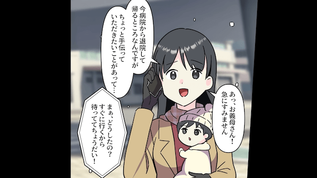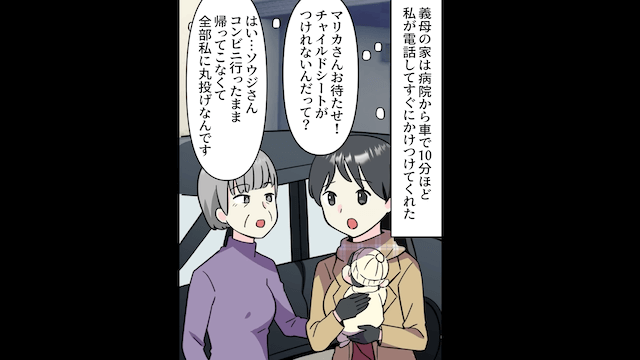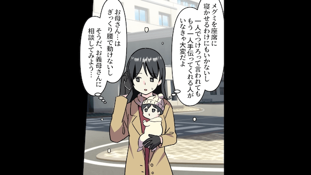しかし夫はなにも協力せずコンビニに行ってしまい、困り果てた主人公は義母に来てもらったのでした。