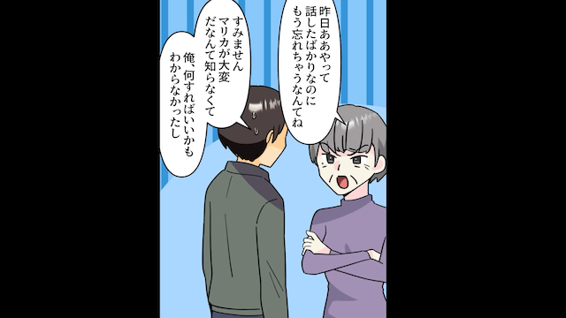 夫が話し合いの途中で飲みに行ってしまったため、主人公は迷わず義母を呼びました。 そして義母と一緒に夫を責めた後、主人公が離婚をほのめかすと、焦った夫は心を入れ替えると宣言したのです。