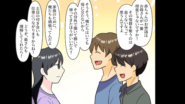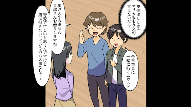 夫は育休が明けてから約束をすっかり忘れ、自分の友人との時間を優先するようになりました。 さらに夫は、主人公に文句を言わせないためにわざわざ友人を紹介してきて…。