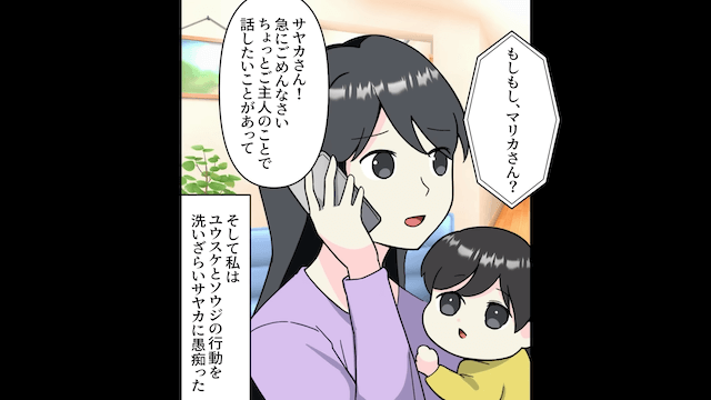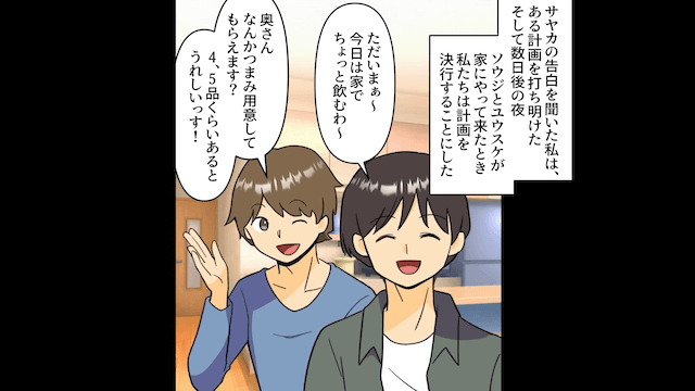 数日後、家で飲み会をしようとしている夫と夫の友人の前に、主人公と夫の友人の妻が立ちはだかり…。