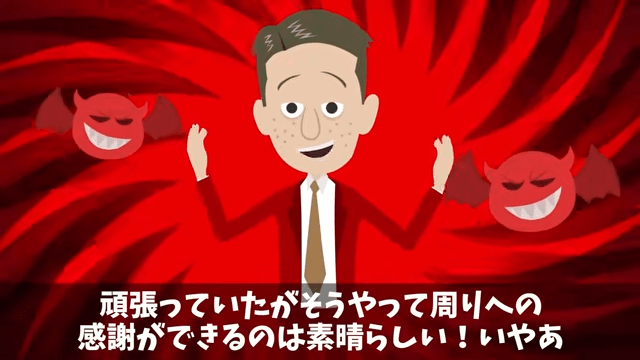 今回は『上司「プレゼン資料作れ!発表は俺(笑)」俺「はーい」しかし当日⇒俺の意図に気づき上司絶句』を紹介します。 プレゼンを終えて帰社した主人公は、報告のために社長のもとへ向かいました。 すると上司が同僚に「今回も頑張ってくれたんだな!本当にお疲れ様だ!」と言い、同僚が「…ありがとう、ございます…」と頭を下げていて…。