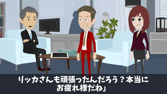 今回は『上司「プレゼン資料作れ!発表は俺(笑)」俺「はーい」しかし当日⇒俺の意図に気づき上司絶句』を紹介します。 プレゼンを終えて帰社した主人公は、報告のために社長のもとへ向かいました。 すると上司が同僚に「今回も頑張ってくれたんだな!本当にお疲れ様だ!」と言い、同僚が「…ありがとう、ございます…」と頭を下げていて…。