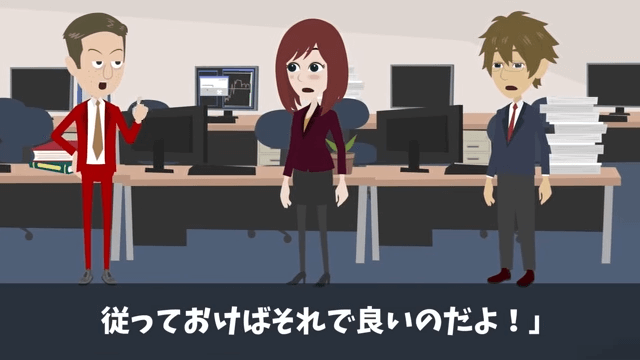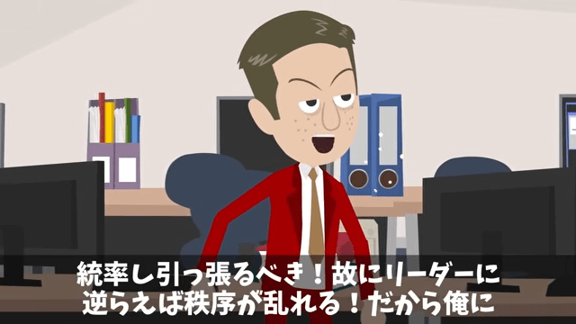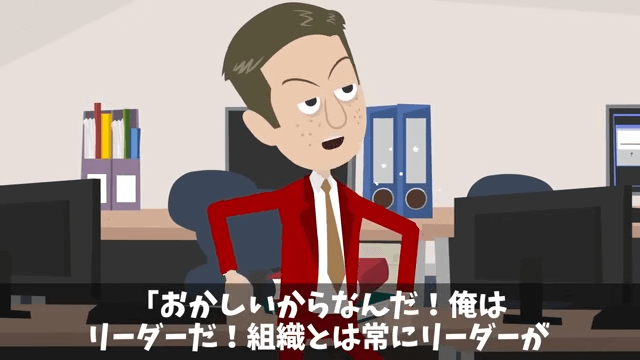 上司からプレゼンの資料作成を丸投げされ、反論した主人公。 すると上司は「組織とは常にリーダーが統率し引っ張るべき!」「俺に従っておけばそれでいいのだよ!」と言い…。