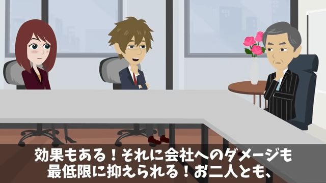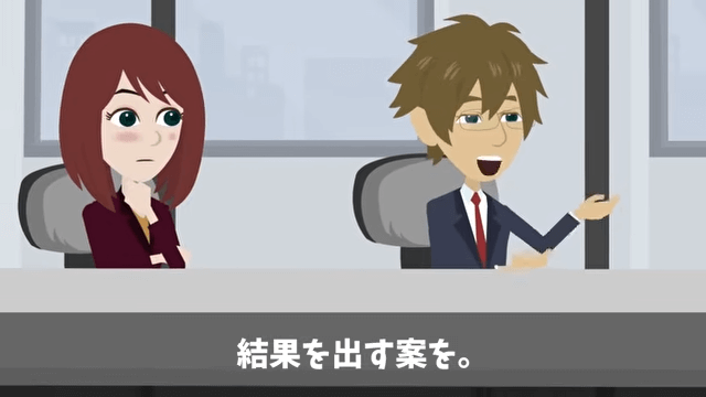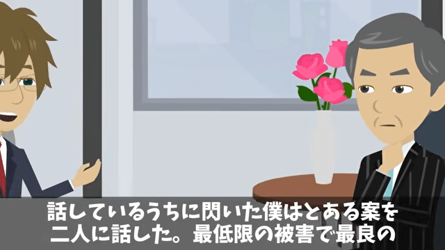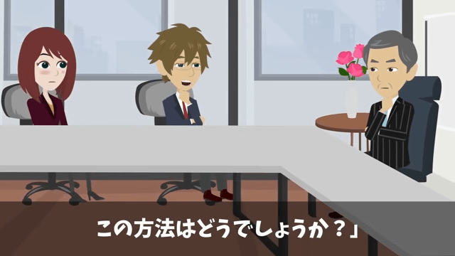 社長の言葉に感謝しつつも、上司に一矢報いるのは難しいのではないかと考えていた同僚。 すると主人公は、自分がひらめいた案を社長と同僚に話し始めて…。