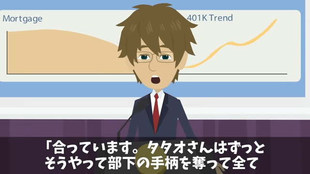 取引先の社長は、上司に「彼が作った資料を自分が作ったと嘘をつき、盗用する形でプレゼンをした上に私たちの質問に答えられず無駄な時間を浪費した…あなたの罪はこれで合っているわね?」と言い放ちました。 それに対し上司は「い、いえ…」と言いますが、主人公は「合っています」と言い切って…。