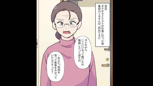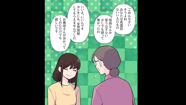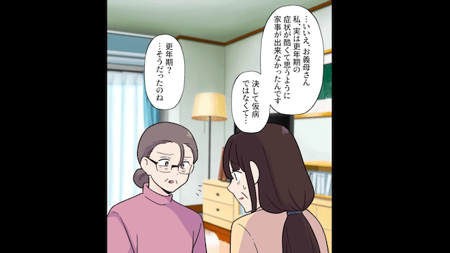 翌日、主人公が家にやってきた義母にこれまでの経緯を説明すると、義母は事情を理解してくれて…。