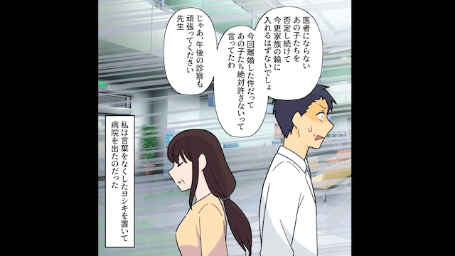 子どもたちに嫌われていることに気づかず「俺を尊敬しているはずだ!」と主張する夫。 主人公はそんな夫に「あの子たちを否定し続けていまさら家族の輪に入れるはずないでしょ」と言い放ち、その場を去りました。