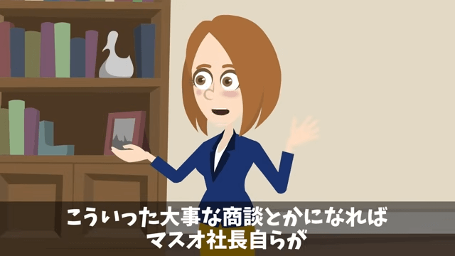 主人公は取引先の社長に「本日も何か商談のお話でしょうか?そういうことでしたら僕が対応させていただきますが…」と伝えました。 すると取引先の社長はうなずき「こういった大事な商談とかになれば社長自らが対応してくださりますので安心できますし、信頼もできるんですよね。ただ…」と言って…。