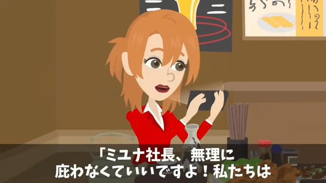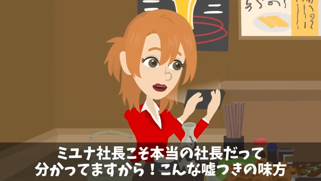 秘書は主人公が本物の社長であることを新人の女性に伝えました。 しかし新人の女性はそれを一切信じず、無理に主人公を庇わなくていいと秘書に言い…。