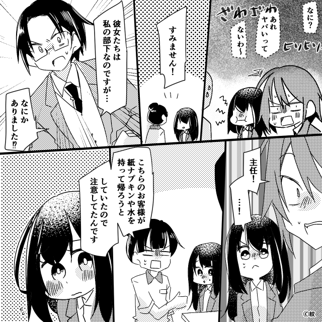 今回は『私の同期はモンスター。』を紹介します。 レストランの紙ナプキンや水を持って帰ろうとする同僚。 主人公が衝撃を受けていると「あの」と声をかけられ…。