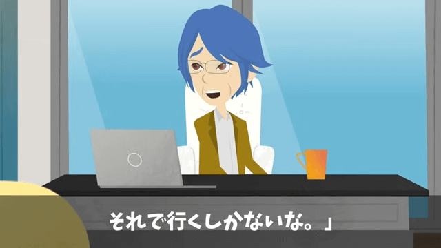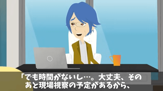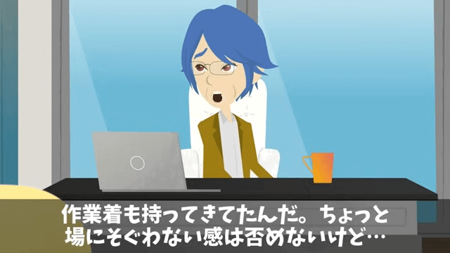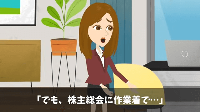 コーヒーを飲もうとした主人公は、手元が狂い、スーツ全体にコーヒーをこぼしてしまいます。 しかし着替える時間がなかったため、主人公は作業着で株主総会に行くことにしました。