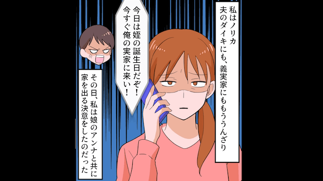 今回は『娘より”姪っ子”を優先する夫「姪っ子の誕生日だぞ!今すぐ実家に来い!」⇒娘の誕生日を忘れていたので離婚した結果』を紹介します。 夫にも義家族にも、うんざりしていた主人公。 そんなある日、夫から「今日は姪の誕生日だぞ!今すぐ俺の実家に来い!」と呼ばれた主人公は、家を出る決意をして…。