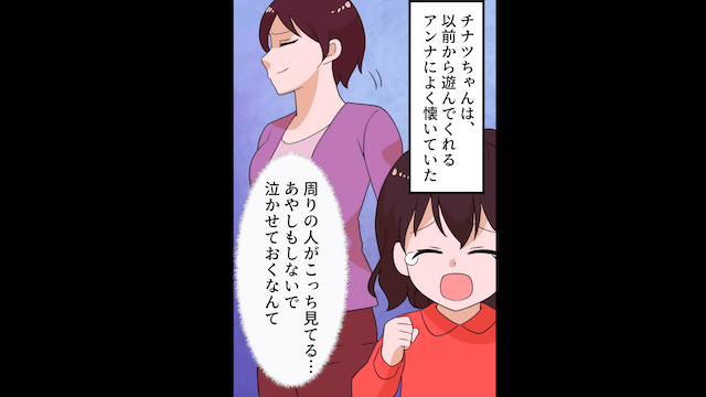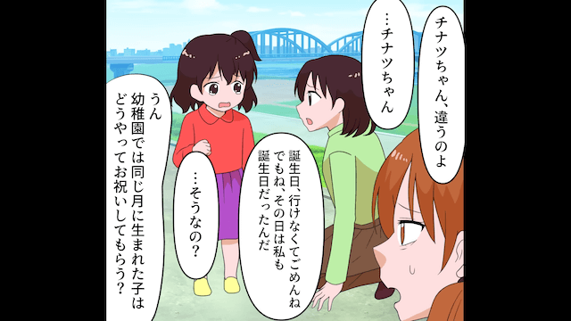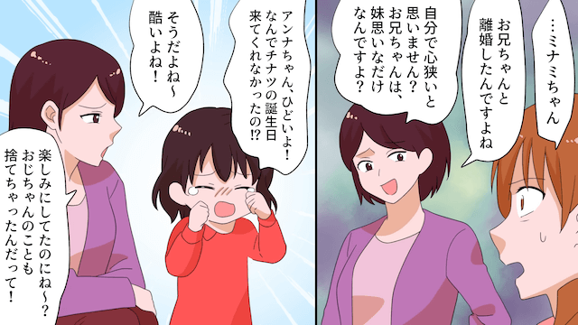 職場にやってきた夫は主人公を引きとめてきましたが、主人公の意思は固く、正式に離婚が成立しました。 その後、新居に引越した主人公が娘と公園に行くと偶然義妹親子に会い、姪は娘が誕生日会に来てくれなかったことを悲しんでいて…。