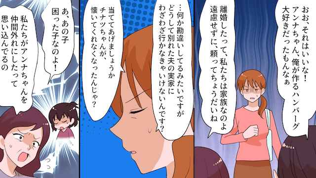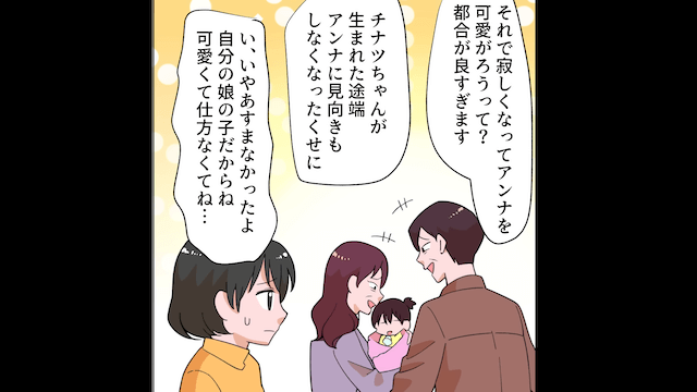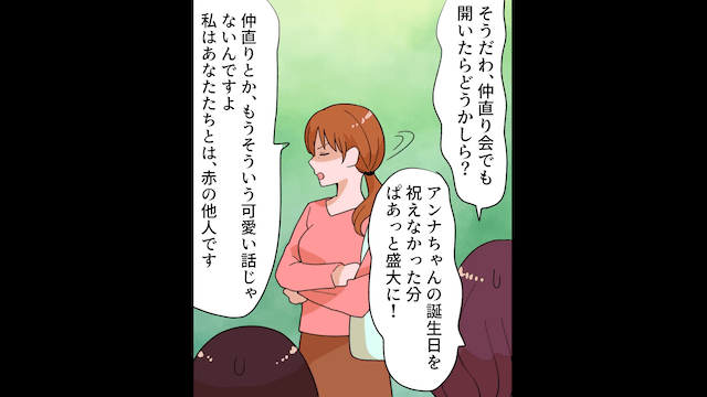 娘の言葉を聞いた姪は「じゃあひどいのはママじゃん!」と言い、夫や義家族が娘を蔑ろにしていたことに気づきました。 その後、姪から冷たい態度をとられるようになった義両親は、主人公や娘と関わろうとしてきましたが、呆れた主人公は「私はあなたたちとは赤の他人です」と告げて…。