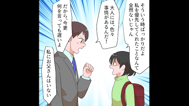 主人公が娘のことを褒めて学校から出ようとしていると、校門で夫が待っていました。 夫は「俺も中で聞きたかったなぁ」と言いますが、娘から「いまさらなにを言っても遅いよ」と拒絶されてしまい…。