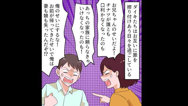 逆ギレして主人公の腕をつかんだ夫は、通報され、パトカーで連行されていきました。 その後、警察沙汰になったことで義両親の食堂は閉店に追い込まれ、夫と義妹は責任をなすりつけ合う日々を過ごすはめになり…。