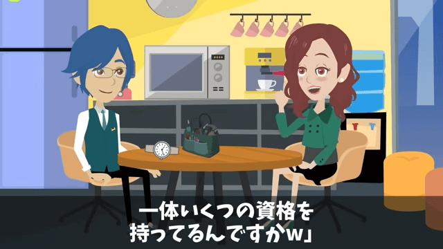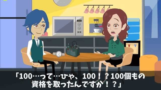 女性社員は主人公に「いったいいくつの資格を持ってるんですか」と尋ねました。 すると主人公は「うーん…ざっと100くらいかな?」と答えて…。