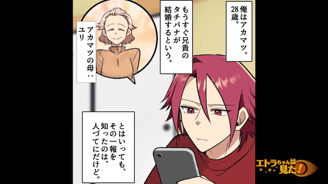 今回は『新郎「破局します」披露宴で新郎が激怒したワケ』を紹介します。 母から兄の結婚報告を受けた主人公は、妻に「兄貴が結婚するらしいよ」と伝えました。 すると妻は「お兄さん、いい人見つかってよかったね」と言い…。