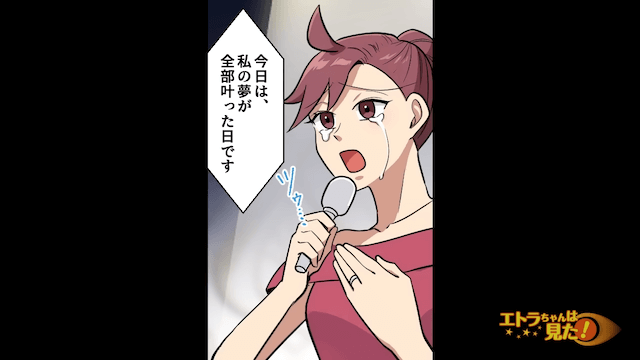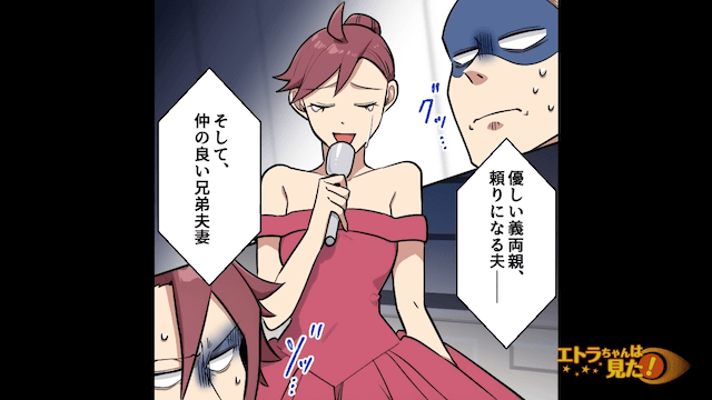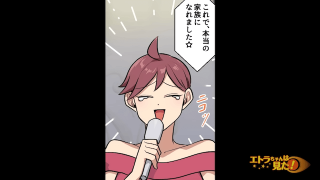 席に戻った主人公は、妻から「大丈夫?顔、真っ青…」と心配されました。 そして披露宴の終盤、スピーチを始めた女性は嬉し涙を流しながら「これで本当の家族になれました」と話したのです。