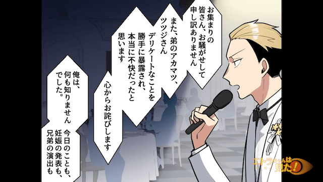 主人公の発言を聞き、強引なサプライズが迷惑だったことを女性に伝えた兄。 そして兄はマイクを持ち、参列者や主人公夫婦に謝罪をしたのです。