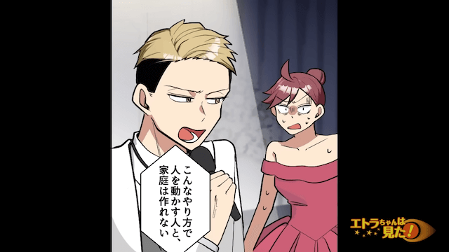 さらに「こんなやり方で人を動かす人と家庭は作れない」とつぶやき、皆の前で「俺たちはこのまま破局します」と宣言したのでした。