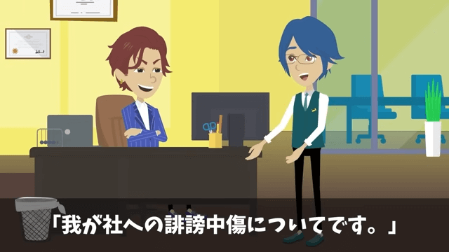 社長のもとにやってきた主人公は「今日は大事なお話があります」と言いました。 そして主人公が「我が社への誹謗中傷についてです」と話すと…。