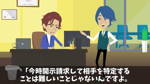 今回は『新社長「貧乏派遣社員は用済み!クビで(笑)」俺「いいのね?」後日⇒社長として再会した結果』を紹介します。 主人公は発信者情報の開示請求をしたことや、デマの書き込みが社長の仕業だと判明したことを話しました。 しかし社長は、まだ今の状況がよくわかっていないようで…。