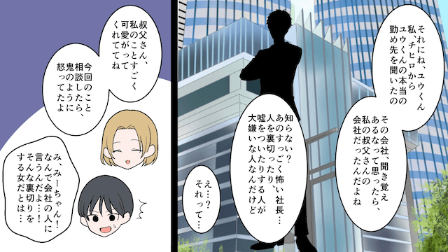 さらに彼氏の本当の勤め先は親友の叔父の会社で、今回の件はすでに叔父に知られていて…。