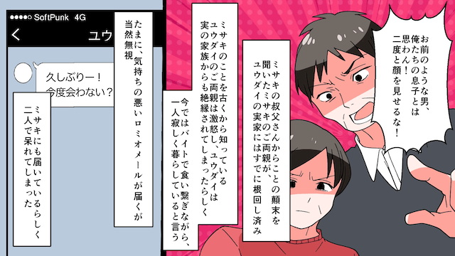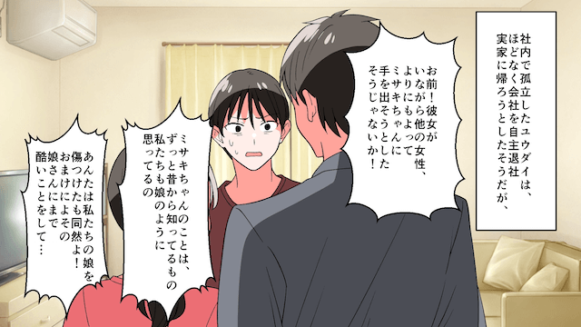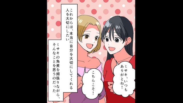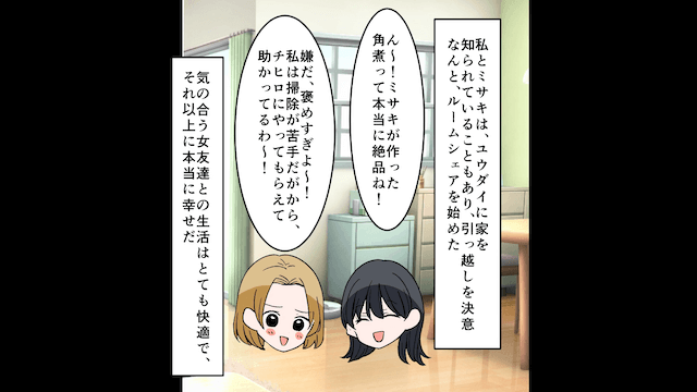主人公に突き放された彼氏は、社内で孤立して自主退社し、両親にも絶縁を突きつけられます。 一方、主人公と親友はルームシェアを始め、快適で幸せな生活を送ったのでした。