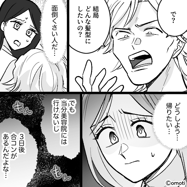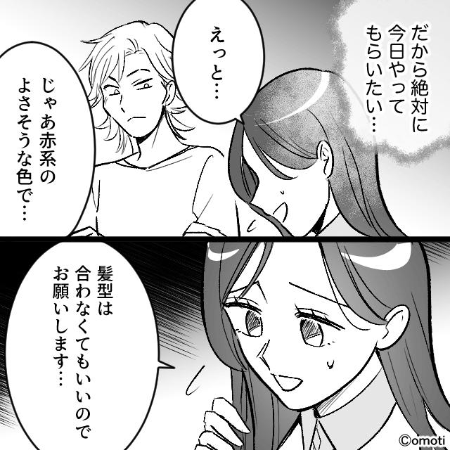 「あんたどんな髪色にしたいの?とんでもない色になるよ!?」と突然怒鳴り、主人公の髪を雑に触ってきた男性。 いつも担当美容師に同じように伝えていた主人公は、男性に突然怒鳴られて困惑します。