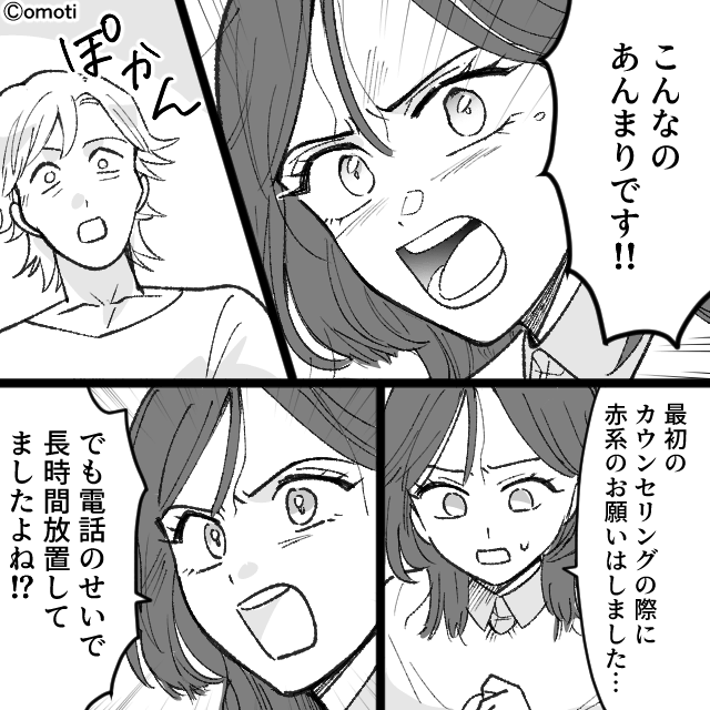 その後、完成した髪型は希望のものとはまったく違い、長時間カラーを放置したせいで髪は傷んでいました。 主人公はショックを受け「こんなのあんまりです!!」と抗議して…。