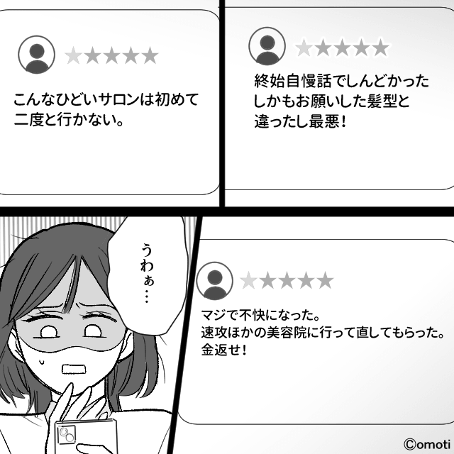 今回は『ヤバすぎる“代理美容師”の話』を紹介します。 他に被害者を出させないため、不快になった気持ちを口コミに書こうとした主人公。 他の人の意見も気になり、口コミサイトを見てみると…。