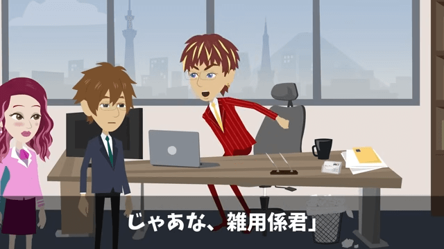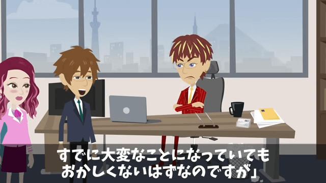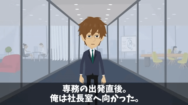 主人公がこれ以上は後で困ることになると忠告しても、専務は聞く耳を持ちませんでした。 そして専務が出発した直後、主人公は社長室に向かい…。