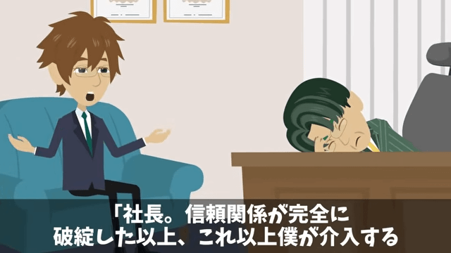 専務が反省していないと知った社長は、頭を抱えました。 主人公はそんな社長に「信頼関係が完全に破綻した以上、これ以上僕が介入することは、プロとして不可能です」と伝えて…。