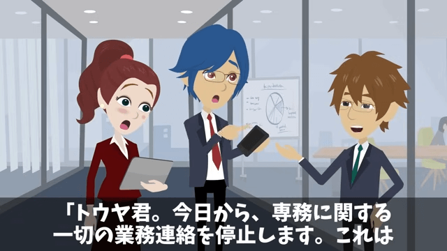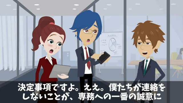 主人公は社員たちに、専務に関する業務連絡を一切停止すると伝えました。 そして主人公は、専務に連絡しないことが一番の誠意になると説明したのです。