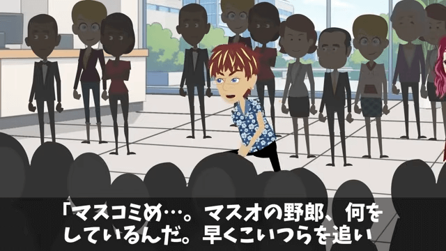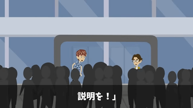 専務たちがようやく会社に到着すると、そこにはたくさんの記者たちが待ち構えていました。 記者たちは専務に説明を求めますが、専務はそれを無視して会社の中に入っていきます。