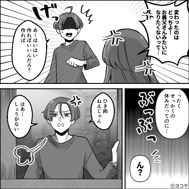 夫が「俺今日はハンバーグの気分だわ」と偉そうに言うため、ため息をつきながら言い返した主人公。 すると夫は「お前変わっちまったな」と主人公を責めてきます。
